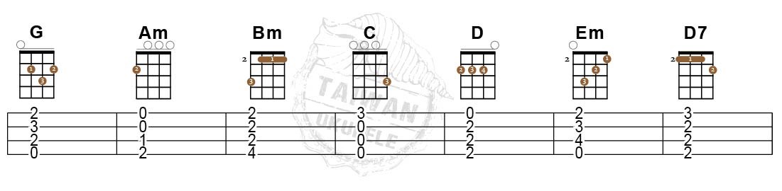 G大調的烏克麗麗歌曲,也是經常出現在流行音樂中,Bm、D、D7和弦指型,是 這篇教學的練習重點!也是邁向封閉和弦的開始啊^^